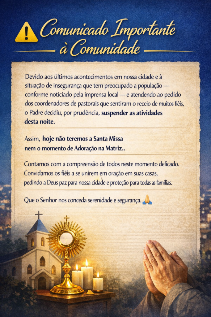 Devido aos últimos acontecimentos registrados em nossa cidade e à situação de insegurança que tem preocupado a população — conforme noticiado pela imprensa local —, e atendendo também ao pedido dos coordenadores de pastorais, que perceberam o receio de muitos fiéis, o Padre decidiu, por prudência e cuidado com todos, suspender as atividades desta noite.